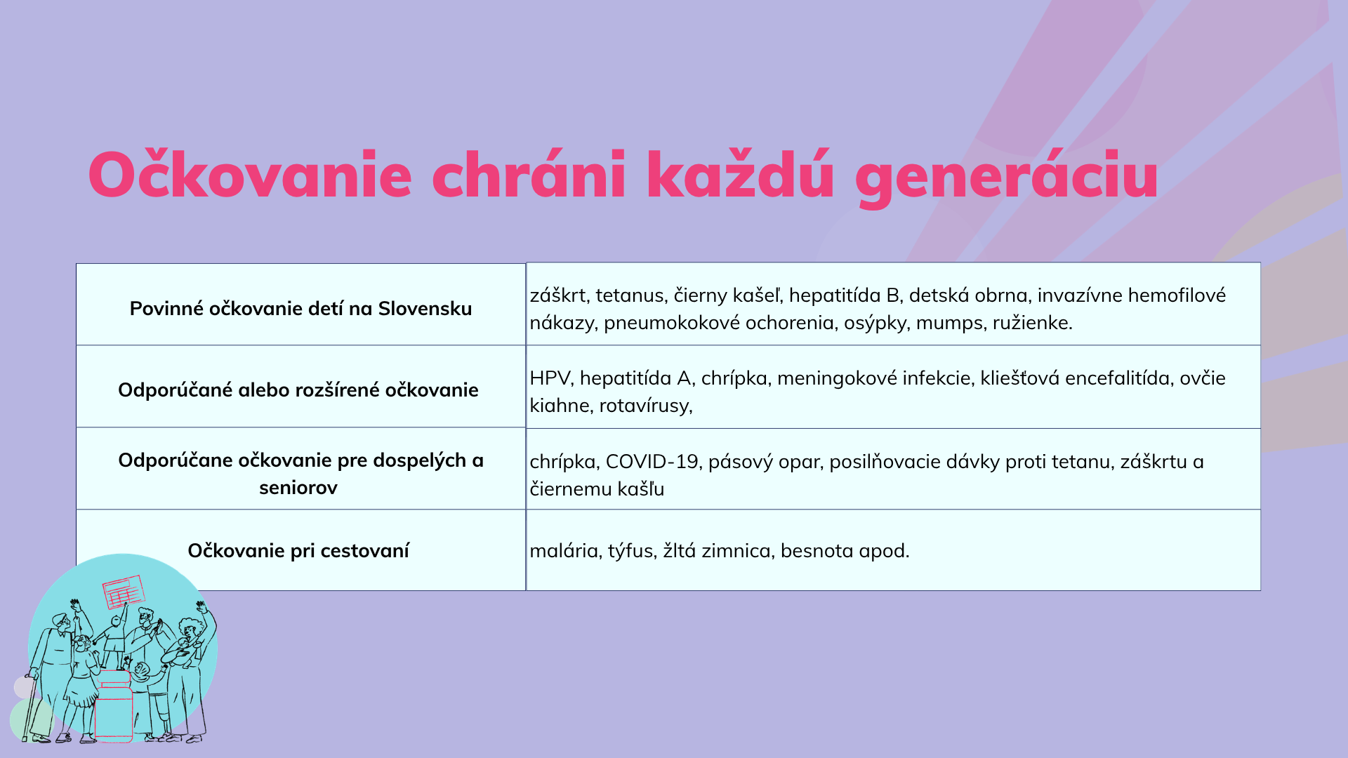 Očkovanie je naša spoločná zodpovednosť. Chránime ním nielen seba, ale aj tých najzraniteľnejších, ako napríklad dojčatá, seniorov alebo pacientov s oslabenou imunitou. Očkovanie chráni každú generáciu. To je posolstvo tohtoročného Európskeho imunizačného týždňa, ktorý pripadá na 19. až 25 apríla.